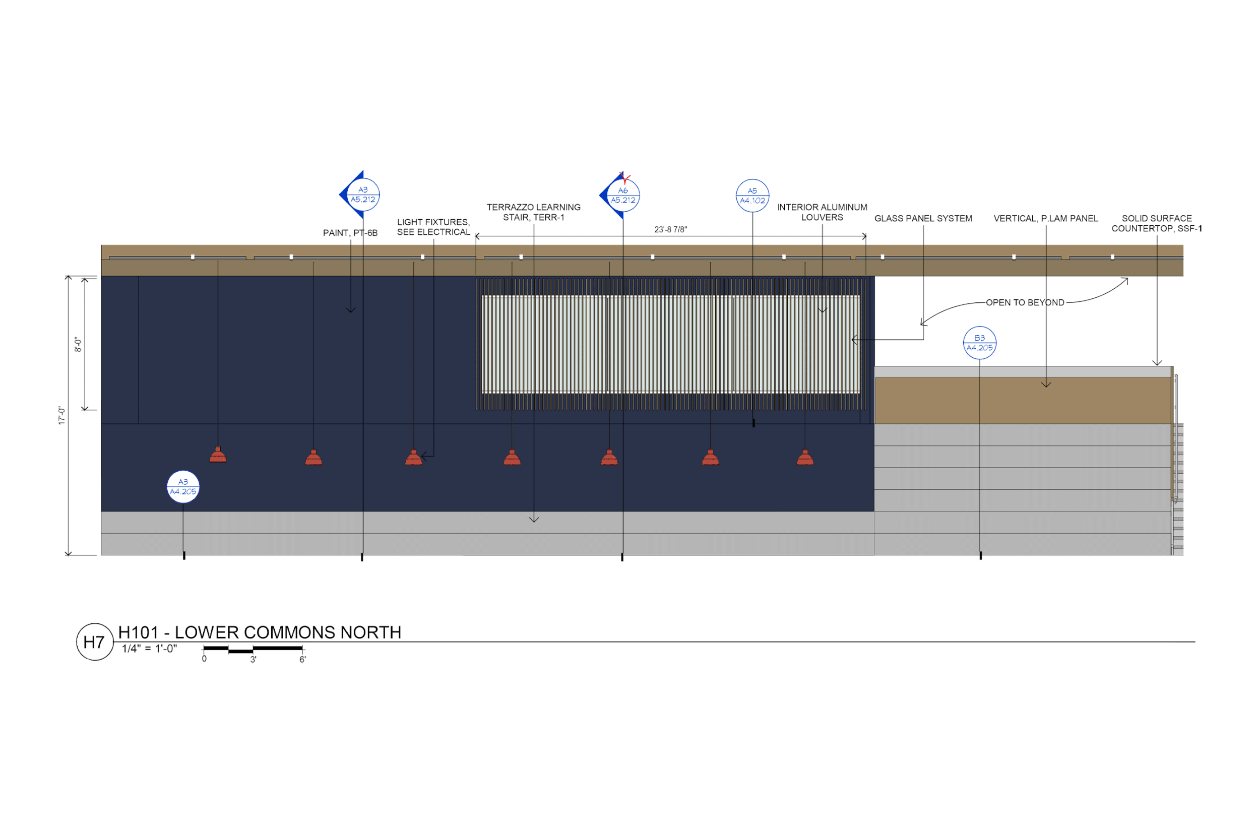 - Interior Elevations: Working with the interior designer for this project, Sam Epping, I was tasked to detail and research product data for the proposed elevations from the Design Development Phase. The curved Learning Commons was a highlight of this project, using large format porcelain tile, wood accents, and way-finding signage to create a very sophisticated corridor that highlights the Auditorium.