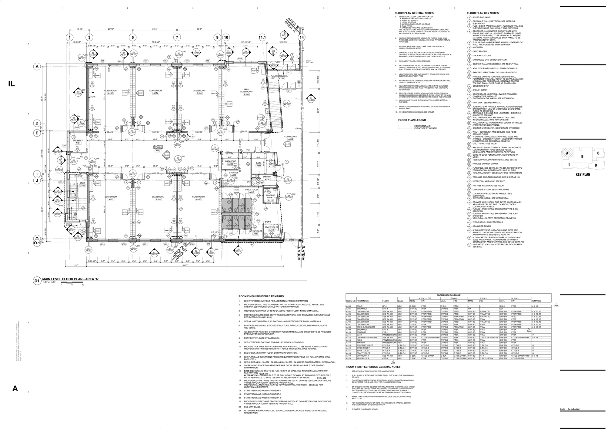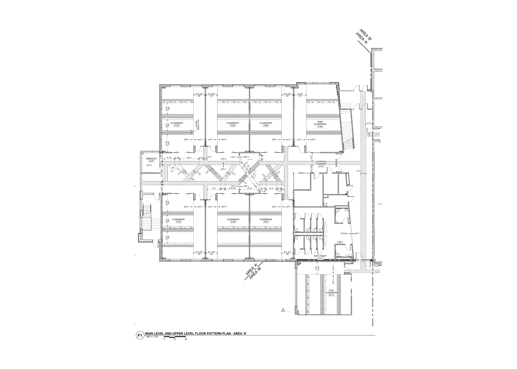 - Floor Finish Plans: Drawing the carpet patterns, gymnasium striping, and LVT patterns was a large task, given the complex lines and angles that the team created. In fact, these complex angles and lines were inspired by the nearby Metra and industrial train tracks.